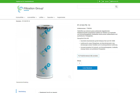 "With the help of avanta we were also able to implement a search for competitor article numbers, which displays a hit list of Filtration Group materials. The matching Filtration Group article is displayed in comparison to the competitor article and can be added to the shopping cart with just a few clicks."